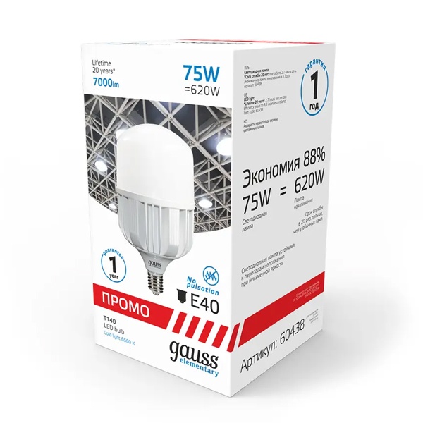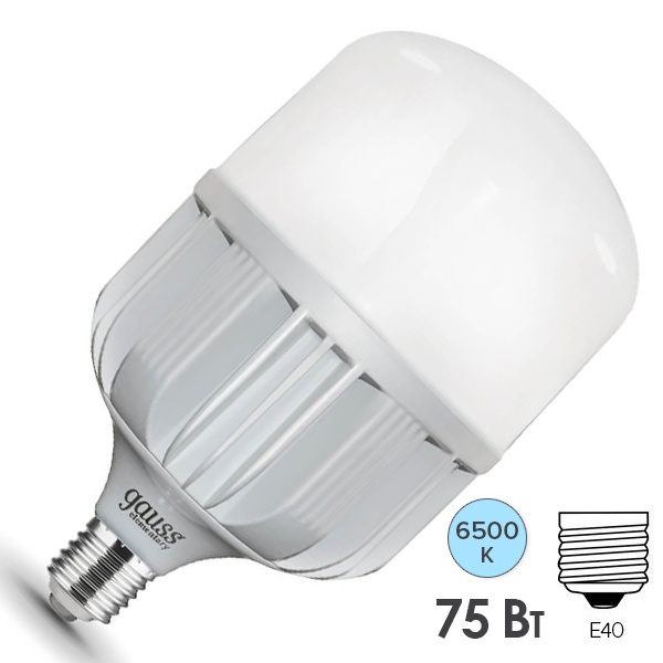 Светодиодная лампа промышленного освещения Гаусс, мощностью 75 Ватт, с цоколем E40, холодный дневной свет 60438