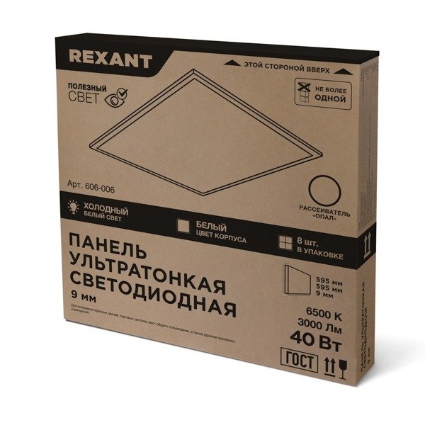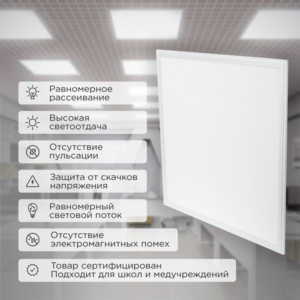 Ультратонкая светодиодная панель REXANT – идеальное решение для освещения офисных зданий, торговых центров, мест общего пользования, а также административных учреждений.Она легко устанавливается на подвесные потолки, накладным способом и на подвесы.Благодаря высокому световому потоку, она освещает гораздо большее пространство, чем обычные светодиодные панели.Безопасность эксплуатации для зрения и здоровья людей обеспечивается отсутствием пульсации и наличием электромагнитной совместимости.С помощью ультратонкой панели REXANT вам будет светло и уютно длительное время.