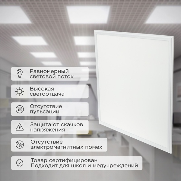 Профессиональная светодиодная панель REXANT – идеальное решение для освещения офисных зданий, торговых центров, мест общего пользования, а также административных учреждений.Она легко устанавливается на подвесные потолки, накладным способом и на подвесы. Отлично подходит для потолков грильято.Благодаря высокому световому потоку, она освещает гораздо большее пространство, чем обычные светодиодные панели.Безопасность эксплуатации для зрения и здоровья людей обеспечивается отсутствием пульсации и наличием электромагнитной совместимости.С помощью профессиональной панели REXANT вам будет светло и уютно длительное время.