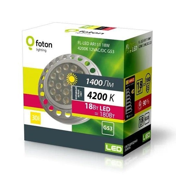 Лампа светодиодная Foton FL-LED AR111 18W 4200K 220V GU10 30° 1400Lm холодный свет — светодиодная лампа форм-фактора AR111 для направленного освещения с цоколем GU10. Обеспечивает яркий ровный свет с узким углом 30°, что делает ее удобной для акцентной подсветки витрин, экспозиций, рабочих зон и интерьерных элементов. Цветовая температура 4200K относится к холодному (нейтрально-холодному) белому свету и подходит для помещений, где важны концентрация и хорошая видимость деталей.