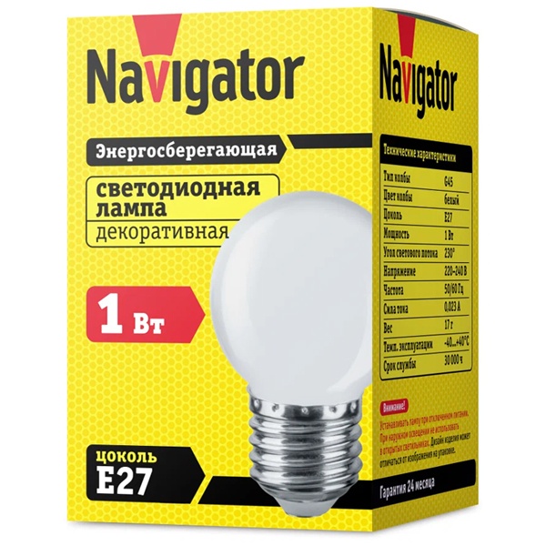 Светодиодные энергосберегающие лампы декоративного освещения Navigator серии NLL-G45-1. Колба лампы выполнена в форме шара. Поверхность колбы матовая, цветная. Идеальное решение для декоративного освещения.
