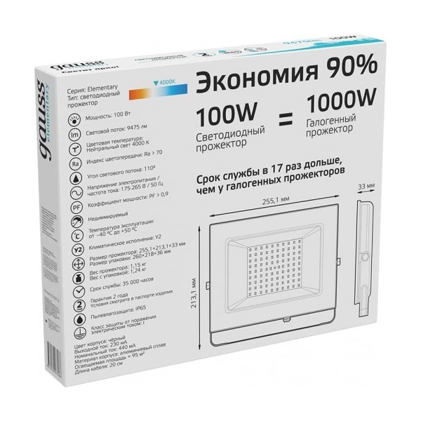 613100110 Прожектор светодиодный Gauss Elementary 100W 4000K 9475lm IP65 черный фото 5