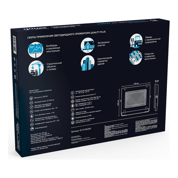 Прожектор LED Qplus, влагозащищенный, морозостойкий, мощностью 200 Ватт, холодный дневной свет 613100200