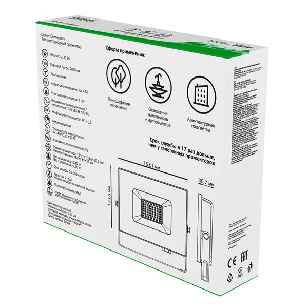 Прожектор светодиодный Гаусс, влагозащищенный, морозостойкий, мощностью 30 Ватт, зеленый свет, для архитектурного освещения и подсветки растений 613100630