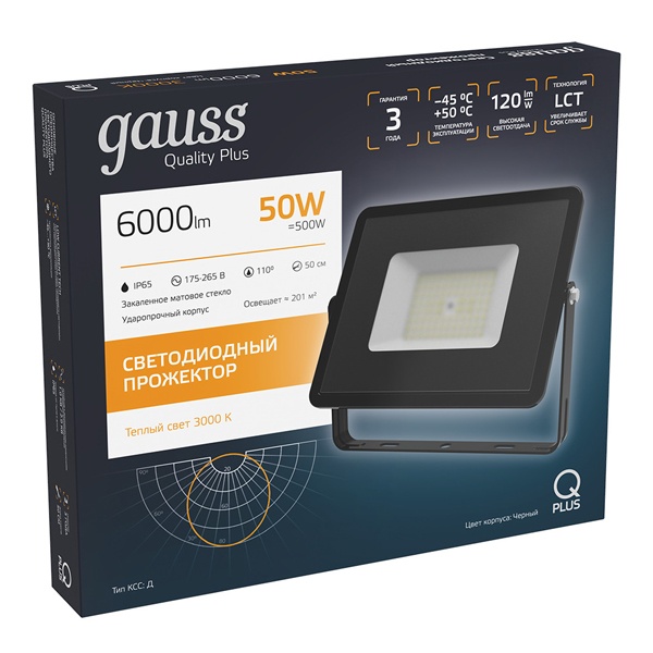Прожектор светодиодный Gauss Qplus 50W 3000K 6000lm IP65 черный 613511150