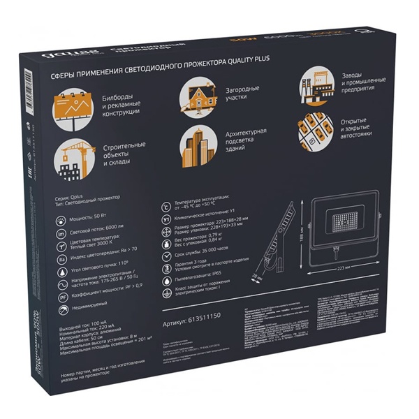 Прожектор LED Qplus Гаусс, влагозащищенный, морозостойкий, мощностью 50 Ватт, теплый белый свет 613511150
