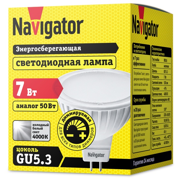 • Лампа светодиодная Navigator 61 383 NLL-MR16-7-230-4K-GU5.3-DIMM 7W 4000K 230V 530Lm