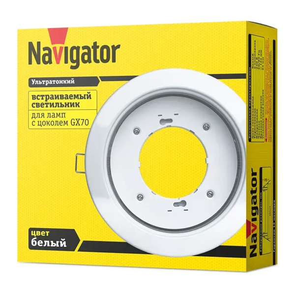Ультратонкие встраиваемые светильники Navigator серии NGX для ламп с цоколем GX70 – энергосберегающая альтернатива светильникам под галогенную или лампу накаливания. Предназначены для освещения жилых и общественных помещений: гостиниц, магазинов, банков, лестниц, лифтов и т.п. Идеально подходят для подвесных и натяжных потолков, мебели и других конструкций.