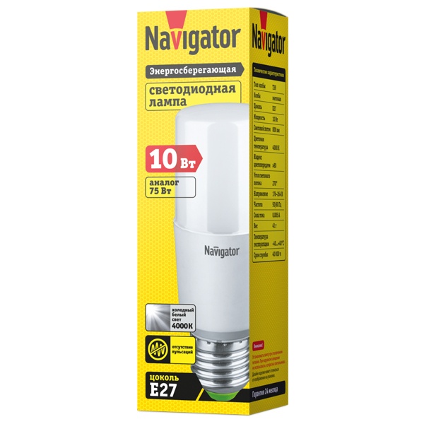 Светодиодная лампочка Навигатор, мощностью 10 Ватт, с цоколем E27, нейтральный белый свет, трубчатая матовая колба 61466