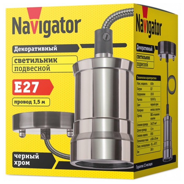 Декоративный подвесной светильник «Винтаж» Navigator, под лампу максимальной мощности 60 Ватт с цоколем E27, черный хром 61520