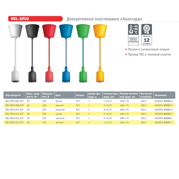 Материалы: - Кожух патрона изготовлен из силикона, патрон и потолочная чаша – из пластика