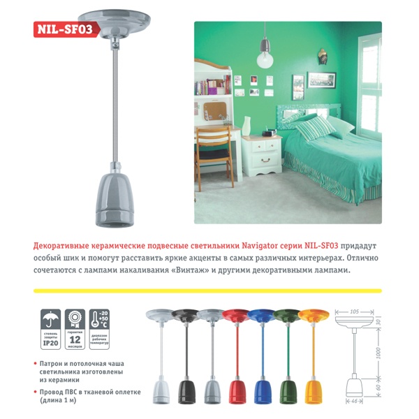 Декоративные керамические подвесные светильники Navigator серии NIL-SF03 придадут особый шик и помогут расставить яркие акценты в самых различных интерьерах. Отлично сочетаются с лампами накаливания «Винтаж» и другими декоративными лампами.