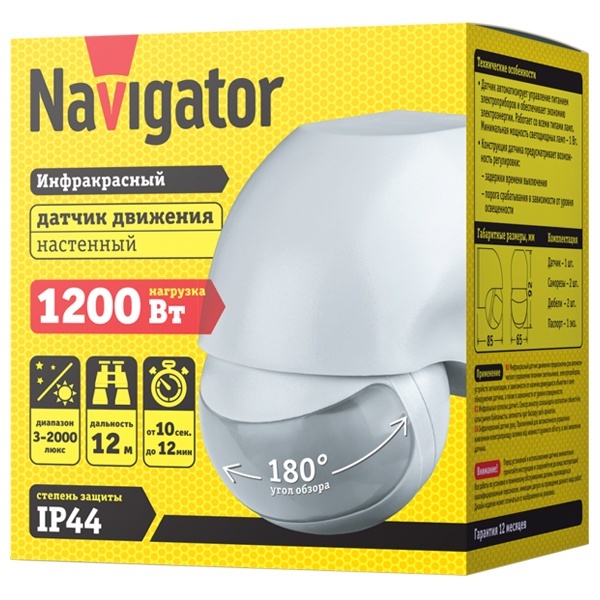 Инфракрасные датчики движения Navigator серии NS-IRM предназначены для автоматического управления пита- нием светильников, электроприборов, устройств сигнализации в зависимости от наличия движущихся объектов в зоне обнаружения датчика, а также в зависи- мости от уровня освещения окружающей среды.