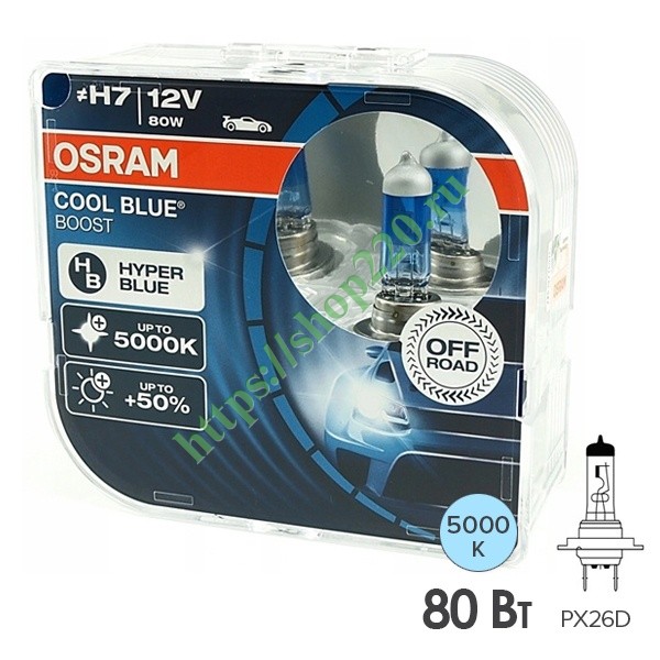 Современные автомобильные галогенные лампы производителя Osram серии Cool Blue Boost излучают неповторимый яркий голубовато-белый свет с цветовой температурой, достигающей 5000 Кельвинов. По сравнению со стандартными галогенными автолампами, модели этой серии с синим покрытием колбы излучают на 50% больше света. Чтобы свет «пробивал» это покрытие и лампы светили с нужной яркостью, потребовалось увеличить их мощность до 80 Ватт. Они относятся к типу Н7 с патроном PX26d и предназначены для ближнего и дальнего света фар легковых автомобилей. Приборы работают от сети 12 Вольт. Увеличенная яркость позволяет лучше различать разметку и дорожные знаки, увеличивая безопасность. Световой поток устройств равен 900 Люменов. Они имеют следующие размеры: