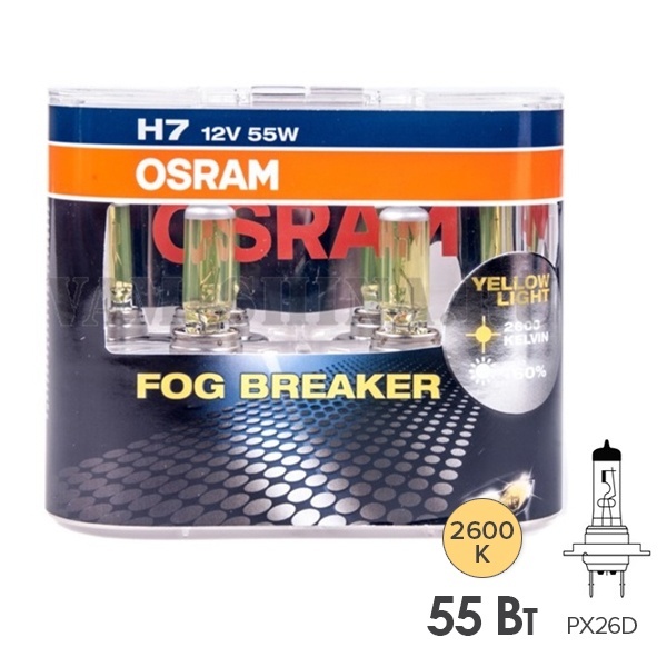 Автомобильные галогенные лампы известного бренда Osram серии Fog Breaker излучают на 200% более желтый свет и увеличивают на 60% освещенность в зоне 75-100 м перед автомобилем по сравнению со стандартными лампами. Они являются идеальными спутниками в туман, дождь и даже в песчаную бурю. Эти источники освещения предназначены для ближнего и дальнего света фар легковых автомобилей и относятся к типоразмеру Н7 с патроном PX26d. Их номинальная мощность равна 55 Ватт, они работают от сети автомобиля 12 Вольт. Лампы обеспечивают лучшую видимость и значительное увеличение времени для совершения маневра. Их световой поток достигает мощности 1750 Люменов, а цветовая температура составляет 2600 Кельвинов. Кроме того устройства надежны и долговечны, их срок службы равен 650 часов. Размеры каждой лампы следующие: