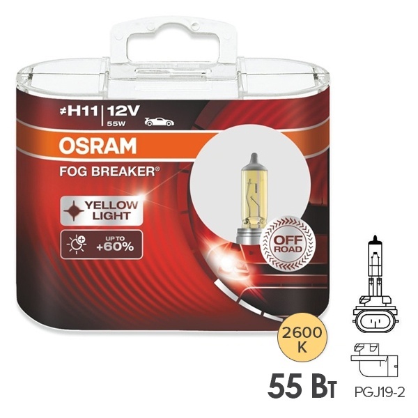 Набор галогенных ламп головного освещения от производителя Osram серии Fog Breaker – это идеальный спутник при движении в тумане, смоге и других сложных погодных условиях. Они излучают более желтый свет и увеличивают освещенность на 60% в зоне 75-100 метров перед автомобилем по сравнению со стандартными лампами. Эти осветительные приборы относятся к типоразмеру Н11 с цоколем РGJ19-2. Номинальная мощность ламп составляет 55 Ватт, они работают от сети автомобиля 12 Вольт. Размеры источника света следующие: