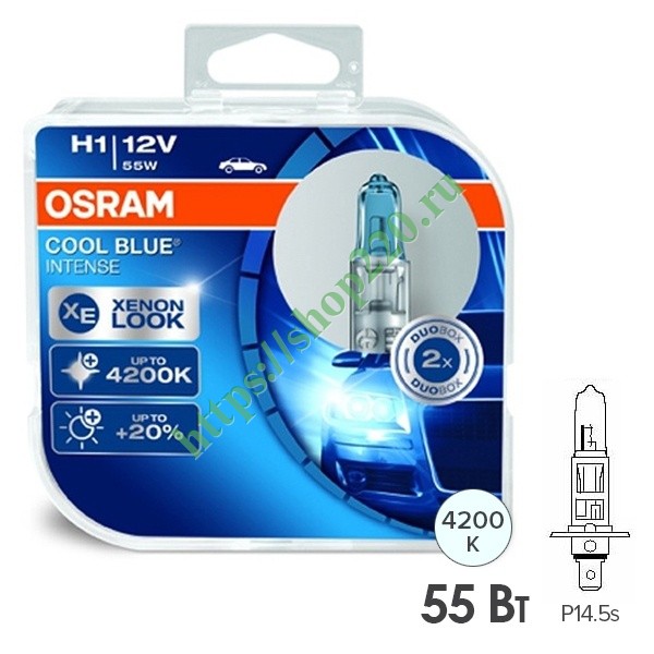 Данный комплект включает в себя современные галогенные лампы головного освещения от известного немецкого производителя Osram серии Cool Blue Intense, которые обладают стильным голубовато-белым светом, близким к свету ксеноновых ламп. Специальная конструкция усиливает световой поток, обеспечивает безопасность использования и более высокую производительность. Они относятся к типу Н1, имеют патрон P14,5s. Эти лампы предназначены для ближнего и дальнего света фар легковых автомобилей, а также для противотуманных фонарей. Источники освещения работают от бортовой сети автомобиля 12 Вольт. Их номинальная мощность составляет 55 Ватт. Высокая контрастность обеспечивает улучшенный обзор ночью и в неблагоприятных погодных условиях. Лампы имеют цветовую температуру 4200 Кельвинов, их световой поток равен 1550 Люменов. Холодный голубовато-белый свет обеспечивает лучшую видимость на дороге, что позволяет реагировать быстрее и дольше поддерживать высокий уровень концентрации внимания. Эти лампы имеют срок службы 250 часов. Они обладают повышенным световым потоком, универсальны и компактны.Каждый прибор имеет следующие размеры: длина – 62,5 мм; диаметр – 9 мм;вес – 5,5 г.Они упакованы в пластиковый бокс в количестве 2 штук.