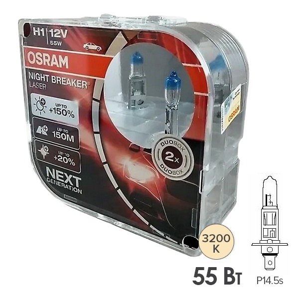 Данный комплект ламп включает в себя самые яркие галогенные модели нового поколения от ведущего мирового производителя Osram серии Night Breaker Laser. Они предназначены для головного освещения легковых автомобилей с бортовым напряжением 12 Вольт. Номинальная мощность приборов составляет 55 Ватт. Лампы относятся к типу Н1 с патроном Р14,5s. Диаметр изделий имеет 9 мм, длина – 67 мм, вес – 6 г. Они имеют цветовую температуру 3200 Кельвинов и световой поток 1550 Люменов. Благодаря инновационным лазерным технологиям и измененному напылению на колбе, галогенные лампы обеспечивают до 150% больше яркости, если сравнивать с минимальными установленными требованиями, а тщательно продуманная структура нити накала позволяет добиться дополнительной светоотдачи. Световой луч от ламп до 150 м длиннее, а излучаемый свет до 20% белее, по сравнению с требованиями, предусмотренными стандартом. Это значительно увеличивает обзор, что позволяет реагировать на дорожные опасности быстрее. Продукты этой серии отличает уникальный дизайн с лазерной гравировкой и высокая светоотдача. Это идеальный выбор для всех, кто понимает, какое значение на дороге имеет яркий свет. В комплект входят 2 лампы, упакованные в пластиковый бокс.