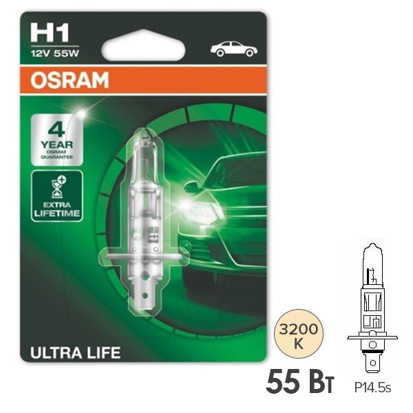 Долговечная автолампа от торговой марки Osram серии Ultra Life представляет собой галогенный источник освещения с более длительным сроком службы по сравнению со стандартными галогенными лампами, что обеспечивает дополнительный комфорт. Эта лампа предназначена для головного света легковых автомобилей. Это идеальное решение для тех, кто часто находится за рулем, а также для тех, кто пользуется дневными ходовыми огнями в светлое время суток. Номинальная мощность лампы составляет 55 Ватт, она работает от сети автомобиля 12 Вольт. Осветительный прибор относится к типу Н1 и имеет тип патрона P14,5s. Параметры изделия следующие: