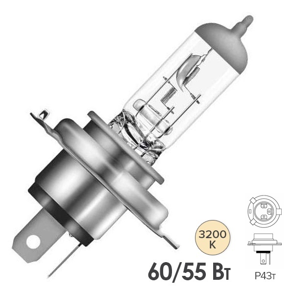 Стандартная галогенная лампа торговой марки Osram серии Original line служит для обеспечения равномерной освещенности проезжей части перед автомобилем и обладает всеми достоинствами современных галогенных ламп. Эта модель относится к типу Н4 с цоколем Р43t. Она имеет две нити накала и ее номинальная мощность составляет 55 и 60 Ватт для разных режимов работы соответственно. Изделие работает от сети автомобиля 12 Вольт и подходит для ближнего и дальнего света легковых автомобилей. Оно излучает яркий желто-белый свет, а его цветовая температура достигает 3200 Кельвинов. Световой поток прибора равен 1000 и 1650 Люменов для каждого режима освещения. Преимуществами этой модели являются: яркий световой луч, долговечность, потребление меньшего количества энергии по сравнению с классической лампой накаливания, легкая замена и компактные размеры. Ее параметры следующие: