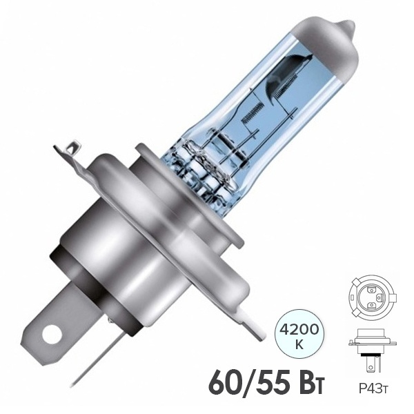 Высокотехнологичная автомобильная лампа крупнейшего производителя Osram серии Cool Blue Intense представляет собой двухнитевый галогенный осветительный прибор с голубовато-белым светом, близким к свету ксеноновых ламп. Мощный свет, с цветовой температурой 4200 Кельвинов, придает автомобилю более стильный вид. По сравнению со стандартными галогенными лампами эта модель ярче на 20%. Этот осветительный прибор излучает самый яркий синий свет, разрешенный законодательно. Также свет этой лампы максимально приближен к естественному дневному свету, что делает его приятным для глаз и не вызывает усталости, в отличие от стандартных источников освещения. Она относится к типу Н4 с цоколем Р43t и предназначена для головного света легковых автомобилей с питанием 12 Вольт. Модель имеет две нити накала и ее номинальная мощность составляет 55 и 60 Ватт для разных режимов работы. Световой поток устройства равен 1000 и 1650 Люменов для каждой нити накала соответственно. Срок службы галогенной лампы составляет примерно 100 и 400 часов для разных режимов работы. Параметры изделия следующие:
