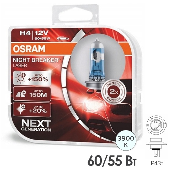 Самые яркие галогенные лампы нового поколения от ведущего мирового производителя автосвета Osram серии Night Breaker Laser с улучшенной на 150% яркостью и излучаемым светом до 20% белее по сравнению с обычными лампами, гарантируют водителям улучшенный обзор. Это позволяет реагировать на опасности на дороге быстрее. Они предназначены для головного освещения легковых автомобилей с бортовым напряжением 12 Вольт. Это двухнитевые устройства, которые относятся к типу Н4 с цоколем Р43t. Номинальная мощность приборов составляет 55 и 60 Ватт для разных нитей накаливания. Благодаря инновационным лазерным технологиям и измененному напылению на колбе, эти галогенные лампы обеспечивают больше яркости, а тщательно продуманная структура нити накала позволяет добиться дополнительной светоотдачи. Световой луч от этих ламп до 150 м длиннее по сравнению с минимальными стандартами. Их цветовая температура достигает 3900 Кельвинов, а световой поток равен 1000 или 1650 Люменов в зависимости от режима освещения. Параметры изделия следующие: