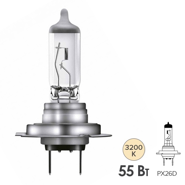 Стандартная галогенная лампа известной компании Osram серии Original line служит для обеспечения равномерной освещенности проезжей части перед автомобилем и обладает всеми достоинствами современных галогенных источников света. Эта модель относится к категории Н7 с патроном PX26d. Лампа имеет одну нить накала, и ее номинальная мощность составляет 55 Ватт. Она работает от сети автомобиля 12 Вольт и подходит для ближнего и дальнего света легковых автомобилей. Лампа излучает яркий желто-белый свет, цветовая температура которого достигает 3200 Кельвинов. Световой поток этого прибора равен 1500 Люменов. Преимуществами изделия является яркий световой луч, долговечность, потребление меньшего количества энергии по сравнению с классической лампой накаливания, легкая замена и компактные размеры. Он имеет следующие параметры: