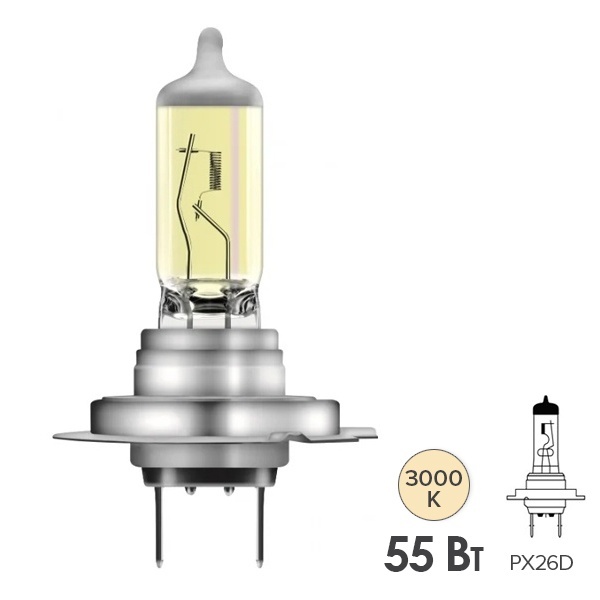 Автомобильная галогенная лампа нового поколения известного немецкого бренда Osram серии All Season Super со специальным желтым покрытием колбы обеспечивает на 30% больше света на дороге даже в самых тяжелых погодных условиях. Увеличенная яркость свечения лампы позволяет водителю видеть дальше и, следовательно, быстрее реагировать на опасности по сравнению со стандартными галогенными источниками. Она относится к категории Н7 с патроном PX26d и предназначена для головного освещения легковых автомобилей с бортовым напряжением 12 Вольт. Номинальная мощность устройства равна 55 Ватт. Оно излучает желтый свет с цветовой температурой 3000 Кельвинов. Мощность светового потока достигает 1500 Люменов. Параметры изделия следующие: