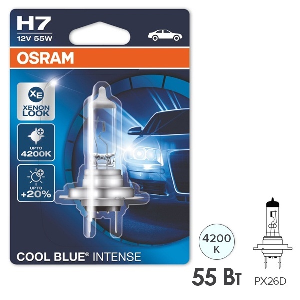 Самая яркая автомобильная лампа крупнейшего производителя Osram серии Cool Blue Intense с голубовато-белым светом, близким к свету ксеноновых ламп, представляет собой галогенный осветительный прибор категории Н7 с патроном PX26d. Она излучает яркий нейтрально-белый свет, разрешенный законодательно. Лампа предназначена для головного освещения легковых автомобилей с напряжением 12 Вольт, ее номинальная мощность составляет 55 Ватт. Яркий белый свет с цветовой температурой 3850 Кельвинов, придает автомобилю более стильный вид. По сравнению со стандартными галогенными источниками света эта модель обеспечивает освещенность на 20% выше. Световой поток устройства равен 1500 Люменов. Также его свет максимально приближен к естественному дневному, что делает его приятным для глаз и не вызывает усталости, в отличие от стандартных ламп. Срок службы модели составляет примерно 200 часов. Ее параметры имеют следующие значения:
