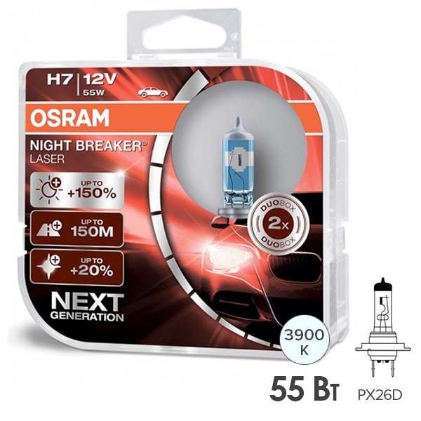 Современные автомобильные галогенные лампы компании Osram серии Night Breaker Laser с улучшенной на 150% яркостью и излучаемым светом до 20% белее по сравнению с обычными галогенными лампами, гарантируют водителям улучшенный обзор, что позволяет реагировать на опасности на дороге быстрее. Благодаря инновационным лазерным технологиям и измененному напылению на колбе они обеспечивают больше яркости, так как обладают световым лучом на 150 м длиннее по сравнению с минимальным стандартами. Эти устройства относятся к категории Н7 с патроном PX26d и предназначены для головного освещения легковых автомобилей с бортовым напряжением 12 Вольт. Номинальная мощность приборов составляет 55 Ватт. Их цветовая температура достигает 3900 Кельвинов, а световой поток равен 1500 Люменов. Параметры изделия следующие: