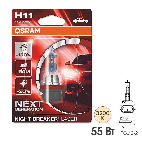 Современная автомобильная галогенная лампа ведущего мирового производителя автосвета компании Osram серии Night Breaker Laser имеет +150% повышенной освещенности и представляет собой самый яркий сертифицированный источник света этого производителя. Благодаря инновационным лазерным технологиям лампа обеспечивает легковые автомобили равномерным насыщенным светом на дороге в любых неблагоприятных условиях и предназначена для бортовой сети 12 Вольт. Эта модель выполнена по типу Н11 с цоколем РGJ19-2. Мощность изделия составляет 55 Ватт, а ее параметры имеют следующие значения: