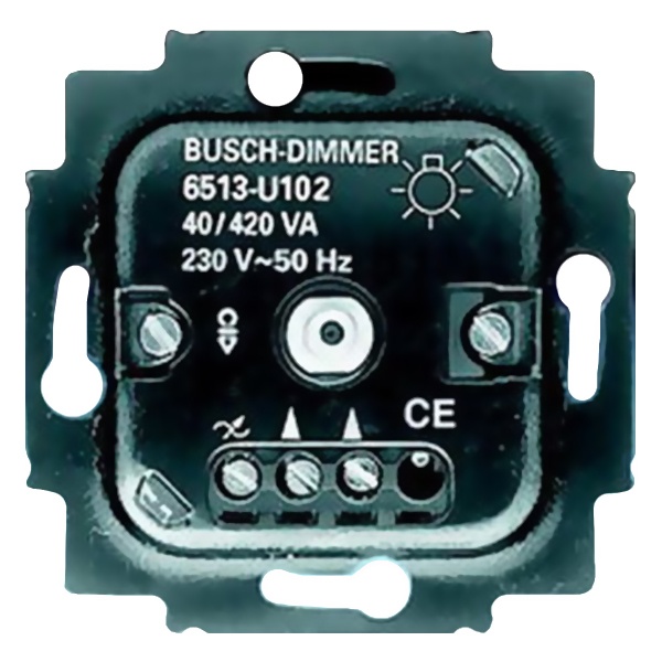 Реле диммера ABB Busch поворотный, с возвратно-нажимным переключателем для включения и регулировки ламп накаливания, галогенных ламп 230 В~ и низковольтных галогенных ламп с электронными трансформаторами. 2CKA006513A0586