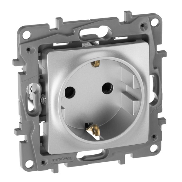 Розетка со шторками с заземлением, винтовой зажим (672422) Легранд (Legrand) серии Этика (Etika). Цвет - алюминий. 672422