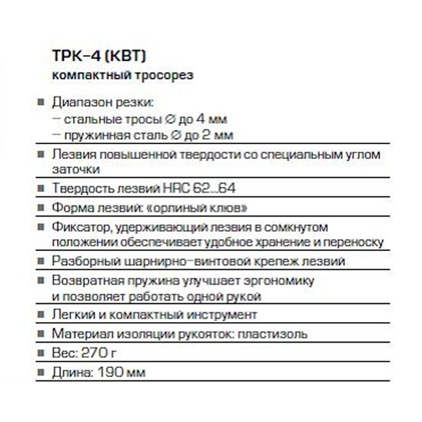 Характеристики по классификатору Etim по данным производителя:Ножницы кабельные / Тросорез EC000142
