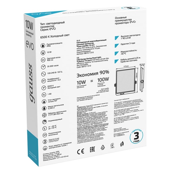 687511310 Прожектор светодиодный Gauss EVO 10W 6500K 900lm IP65 черный