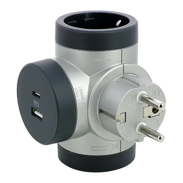 Тройник Комфорт 2xUSB A+C 3А зарядками 2х2К+З алюминиево-черный Legrand — функциональный сетевой адаптер, который расширяет одну розетку до двух силовых розеток с заземлением и добавляет два USB-разъема для зарядки гаджетов. Удобное решение для дома и офиса, когда нужно одновременно подключить бытовую технику и заряжать смартфон, планшет, наушники или другие устройства.