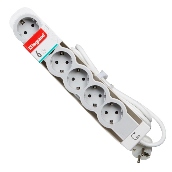 Удлинитель серии «Стандарт» Легранд на 6 розеток с заземлением, с кабелем 5 метров, бело-серого цвета 694572