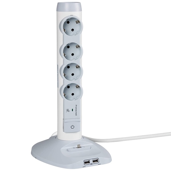 Данный удлинитель представляет собой блок-стойку из нескольких силовых двух контактных и слаботочных розеток, что позволяет одновременно подключить несколько электробытовых прибора, установить на зарядку мобильный телефон, смартфон или планшет, а так же офисную оргтехнику и прочие подобные устройства. Силовые двухконтактные розетки размещены в стойке удлинителя, остальные разъемы находятся в основании устройства. Данный удлинитель оборудован выключателем и сигнальным индикатором, который горит после подачи напряжения на розетки, и затухает после его отключения. Подача тока осуществляется через подключенный к выключателю кабель, длина которого 1.5 м. Краткие технические характеристики. Вид изделия – удлинитель.Назначение – блок подключения.Цвет – белый.Тип стойки - 4+2USB+ microUSB.Розетки на 2 контакта – 4.Разъемы USB – 2.Разъем microUSB – 1.Расчетное напряжение – 220 Вольт.Расчетный ток – 16 Ампер.Кабель – 1.5 м.Защита – степень IP20.Производитель – компания Legrand.Многорозеточные мультимедийные удлинители с кабелем:- Обеспечивают защиту электрического и электронного оборудования, а также телефонных линий от перенапряжения и электрического разряда.- Кнопка сигнализации состояния разрядника (индикатор светится – оборудование защищено, индикатор не светится – удлинитель неисправен и требует замены).- Защищенные разъемы с износоустойчивостью на 10000 операций.- Выключатель с индикатором.- Предусмотрено оптимальное расстояние между розетками, позволяющее подключать трансформаторы, зарядные устройства и т.п.- Сила тока – 16А, максимальная мощность 3500 кВт при напряжении 250 В.- Поставляется с самофиксирующим хомутом для кабелей.- Превосходная адаптация для полной защиты комплекта оборудования Internet.- Совместимость: RJ 45 и RJ 11.- Вводы/выводы: RJ 45 и RJ 11 совместимы с ADSL.- Uc: 200 Вольт.- Uoc: 2 кВ.- Up: 600 Вольт.Особенности удлинителя 694614:- 4 х 2К + З + цоколь с 2 разъемами USB для зарядки + 1 микро-разъем USB для зарядки- 4 х 2К + З с постоянно подключенным питанием- вертикальный блок разъемов с функцией поворота по своей оси- разъем USB 5 В/1000 мА для зарядки сенсорных планшетов, считывающих устройств МР3 и МР4, смартфонов- разъем микро-USB для непосредственной зарядки смартфонов на цоколе- цвет: белый/серый