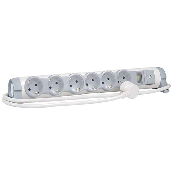 Устройства распределения энергии, входящие в производственную категорию «Комфорт и безопасность» Legrand, увеличивают рабочие возможности основных силовых розеток, при этом предохраняя электрические механизмы от экстремальных перегрузок.Предлагаемое здесь профильное изделие – удлинитель с колодкой на шесть стандартных разъемов. Каждая розетка оборудована дополнительным контактом заземляющего контура, обеспечивающим безопасность человека при подключении неисправных электроприборов. К горизонтальной плоскости штекерные вводы расположены под углом 45 градусов, что способствует большему удобству установки соединений при полной загрузке удлинителя.Колодка с разъемами имеет цилиндрическую форму и свободно расположена на двух опорах. Осевое положение легко изменяется в нужном направлении. Все элементы корпусной конструкции изготовлены из прочного, термостойкого пластиката.Клавиша общего выключателя оснащена индикацией, которая визуализирует рабочее состояние устройства и уровень общей нагрузки. При превышении расчетной мощности (3,5кВт) все розетки удлинителя автоматически отключаются от питания.Многорозеточные блоки серии «Комфорт и безопасность»:- Выключатель со световым индикатором, можно включать ногой или рукой.- Конструкция подставок позволяет поворачивать блок в нужном направлении, предусматривая также его крепление к стене, мебели или рабочей поверхности.- Розетки с защитными шторками для защиты детей, способными выдерживать 10000 действий.- Максимальное расстояние между 2 розетками для подключения трансформаторов, зарядных устройств и т.д.- С питающим кабелем (3G 1,5 мм2).- Возможность скручивания кабеля вокруг ножки.- Поставляется вместе с самозажимающимся соединением для группировки проводов подключенных устройств.- Важно: удлинители с несколькими розетками всегда должны быть установлены вместе с модульным устройством защиты от выбросов напряжения на главном пульте.Особенности удлинителя 694646 - индикатор потребленной мощности и защита “Safe control”:- индикатор, показывающий мощность, потребленную подключенными устройствами (максимум 3500 Вт)- выключатель безопасности, который автоматически отключает питание при превышении максимальной мощности- ручное повторное включение