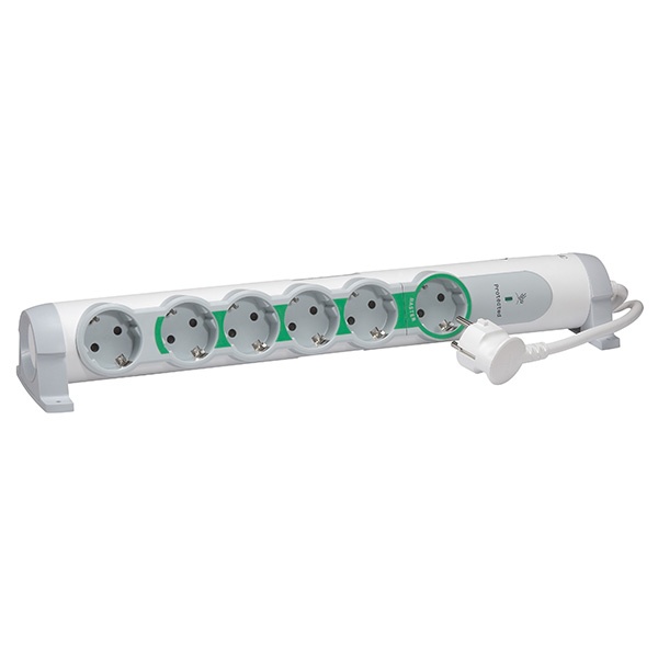 Удлинители с колодкой на несколько розеток, среди которых одна основная (мастер) и остальные зависимые, позволяют значительно снижать суммарный расход электроэнергии в режиме ожидания. Такие устройства актуальны для общего подключения взаимосвязанного оборудования. Например, основной рабочий разъем подает питание на телевизор, а к остальным подсоединяется видео, аудио и игровая техника. Выключение телевизора с помощью пульта или таймера, служит побуждающим сигналом для автоматического отключения зависимых приборов.Здесь, представлено профильное изделие, от ведущей европейской электротехнической компании Legrand. Это удлинитель с шнуром питания – 1,5 метра, с общим количеством розеток – 6 штук, адаптированный к максимальным токовым величинам – 16 Ампер.Колодка удлинителя находится на двух свободных опорах, которые позволяют устанавливать необходимый угол поворота. Все розетки оснащены дополнительным заземляющим контактом, обеспечивающим безопасность пользователя в случае токовых утечек на массу неисправного оборудования. Клавиша выключателя оснащена индикацией, удобна для включения/выключения рукой или ногой.Многорозеточные блоки серии «Комфорт и безопасность»:- Выключатель со световым индикатором, можно включать ногой или рукой.- Конструкция подставок позволяет поворачивать блок в нужном направлении, предусматривая также его крепление к стене, мебели или рабочей поверхности.- Розетки с защитными шторками для защиты детей, способными выдерживать 10000 действий.- Максимальное расстояние между 2 розетками для подключения трансформаторов, зарядных устройств и т.д.- С питающим кабелем (3G 1,5 мм2).- Возможность скручивания кабеля вокруг ножки.- Поставляется вместе с самозажимающимся соединением для группировки проводов подключенных устройств.- Важно: удлинители с несколькими розетками всегда должны быть установлены вместе с модульным устройством защиты от выбросов напряжения на главном пульте.Особенности удлинителя 694648 - мастер-розетка для отключения электроприборов, находящихся в режиме ожидания (stand-by):- 1 мастер-розетка- 4 зависимые розетки- устройство защиты от перенапряжений с термозащитой