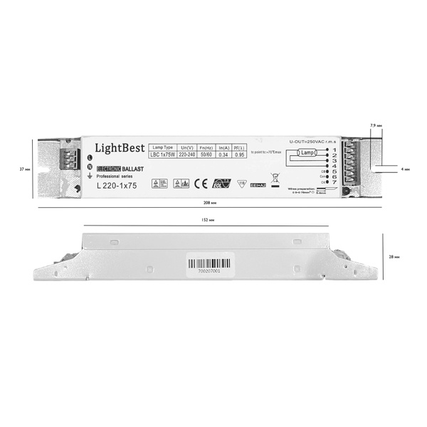 ЭПРА LightBest L 220 1x55-75W для бактерицидных ламп — электронный пускорегулирующий аппарат (балласт) для стабильного питания и запуска одной бактерицидной лампы мощностью 55–75 Вт. Модель рассчитана на работу в сети 220 В и применяется в составе бактерицидных облучателей и УФ-установок, где важны надежный старт, корректный режим работы лампы и компактное размещение внутри корпуса оборудования.