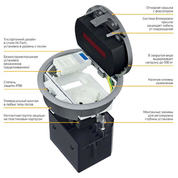 Принцип использования электрических розеток или модулей информационных розеток точно такой же как для миниканалов или кабель-каналов, т.е. применяются модульные электроустановочные размером 45х45мм.