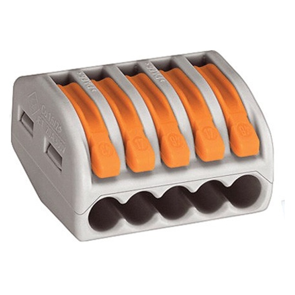 Соединительные клеммники с зажимом захватывает до 5 зачищенных тонкопроволочных проводников от 0,08 мм2 до 2,5 мм2, одножильные и многожильные до 4 мм2.