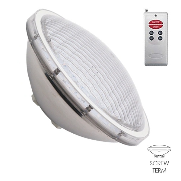 Светодиодные лампы PAR 56 представляют собой профессиональное решение для подводной подсветки бассейнов, фонтанов и прочих объектов. Благодаря сочетанию мощных светодиодов красного, зеленого, синего и белого цвета и встроенного микропроцессора, лампа может излучать полный цветовой спектр. Лампа может работать как в режиме непрерывного изменения цветов, так и в режиме одного цвета. Управление осуществляется с помощью ДУ пульта. Также можно управлять лампой с помощью обычного выключателя, для этого необходимо выключить лампу, а затем быстро включить ее снова.
