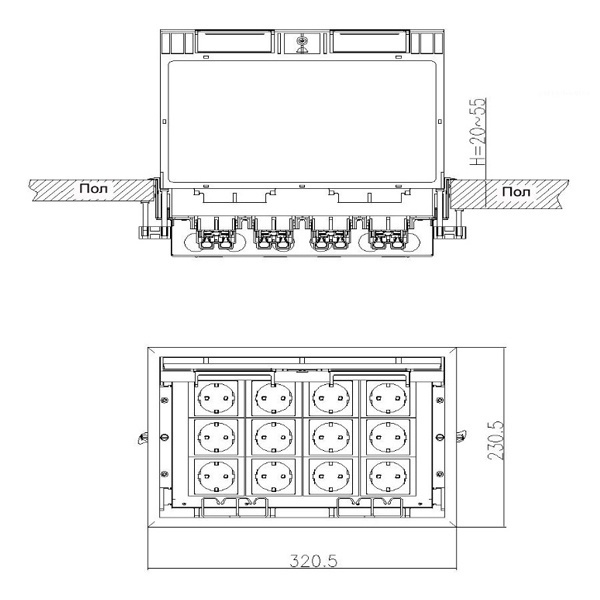 На поверхность люков на 6-8-12 постов размером 45х45 мм могут устанавливаться как стандартные пластиковые поверхности крышки, так и материалы, повторяющие фактуру и цвет окружающего напольного покрытия (паркет, линолиум и т.д.).