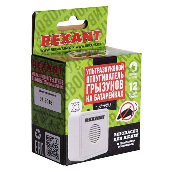Ультразвуковой отпугиватель грызунов Рексант, площадь действия 20 м2, питание от батареек 71-0013