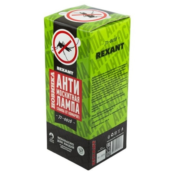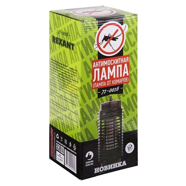 Антимоскитная лампа Рексант R30 71-0016 излучает ультрафиолетовый свет 350-400 нм, который притягивает комаров и мошкару. Они подлетают к лампе и погибают коснувшись металлической решетки от электрического разряда. В специальный поддон подают погибшие насекомые. Радиус действия одной лампы составляет 30 квадратных метров.