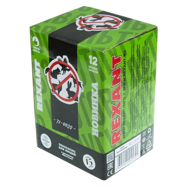Отпугиватель животных Рексант представляет наиболее современную, во многом инновационную модель, принцип работы которой основан на ультразвуковом излучении. Кроме того, данное устройство снабжено инфракрасным датчиком движения, что значительно повышает удобство и эффективность его работы. При этом ультразвуковое воздействие не только эффективно, но и гуманно. Устройство отгоняет собак, кошек, белок, кроликов и других средних и крупных животных, просто пугая их, не нанося их здоровью никакого вреда.В комплекте с устройством идёт подставка для установки отпугивателя в грунт, а так же крепеж для подвешивания на стену. Для использования внутри помещений и на улице.
