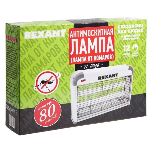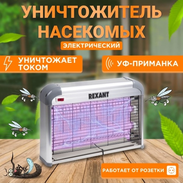 Антимоскитная лампа Рексант - современное экологически безопасное средство по борьбе с комарами, москитами, мошкой, мотыльками и другими летающими видами насекомых внутри помещения. Устройство излучает ультрафиолет и нагревается, тем самым имитирует млекопитающих животных и манит насекомых. Насекомые, подлетая, получают смертельный удар током от металлической сетки под напряжением.