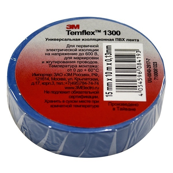 Изолента ПВХ синяя, рулон Temflex™ 1300, рулон 15мм х 10 метров, 3М 7100081323
